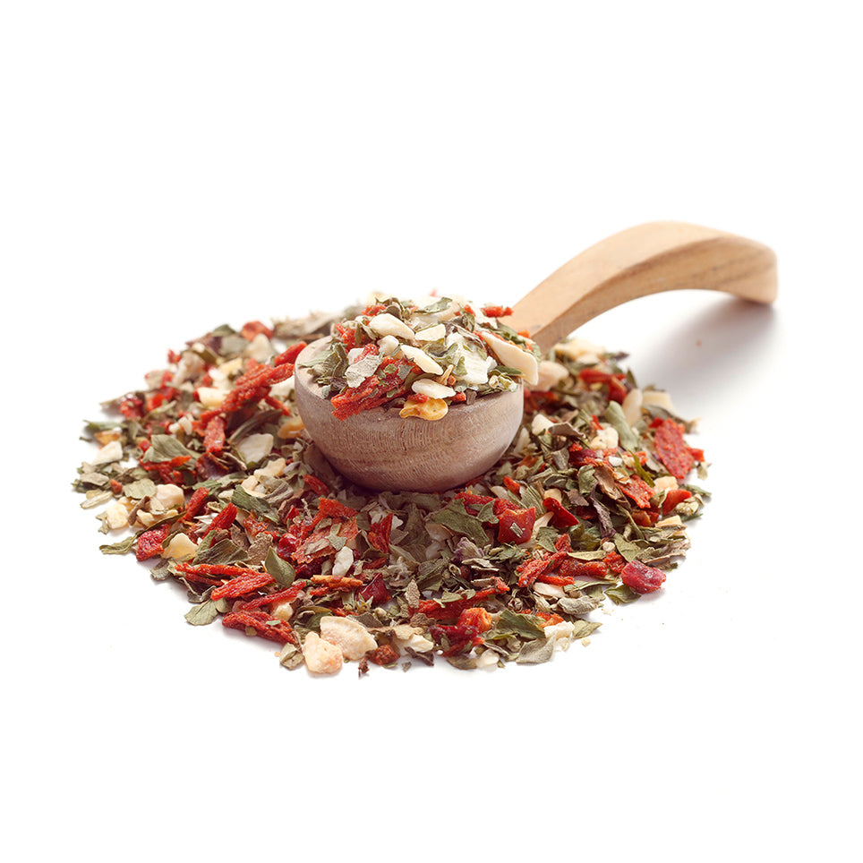 Knoblauch (36%), Tomatenchips (Tomate, Maisstärke), Paprikagranulat rot, Petersilie, Zwiebel, Oregano, Basilikum
