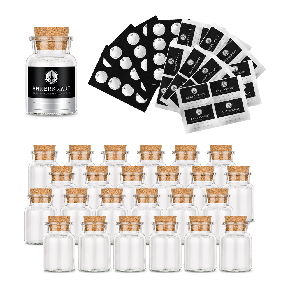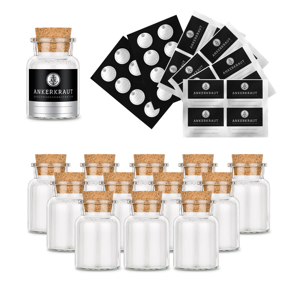 Leeres Korkenglas, klein mit Etiketten und Deckelsiegel